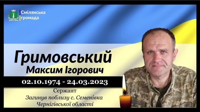 Сержант, Гримовський Максим Ігорович, служив кулеметником прикордонної служби прикордонної комендатури швидкого реагування у прикордонному загоні імені князя Володимира Великого в Новгород-Сіверському районі Чернігівської області. Життя захисника обірвалося 24 березня 2023 року в селі Семенівка Чернігівської області. Йому було 48 років.