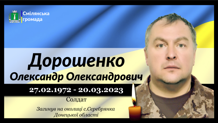 Солдат, стрілець-санітар першого мотопіхотного відділення другого мотопіхотного взводу другої мотопіхотної роти військової частини Збройних Сил України Олександр Дорошенко загинув 20 березня 2023 року в результаті мінометного обстрілу ворожої артилерії на околиці н.п. Серебрянка Донецької області.