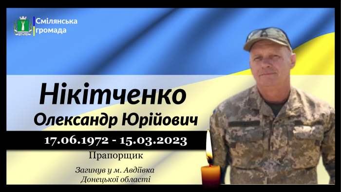 Прапорщик, головний сержант механізованого батальйону військової частини Збройних Сил України Олександр Нікітченко до Небесного війська приєднався 15 березня 2023 року. Під час виконання військових обов’язків, в н.п. Авдіївка, Покровського району, Донецької області, Олександр Юрійович віддав своє життя за майбутнє України!