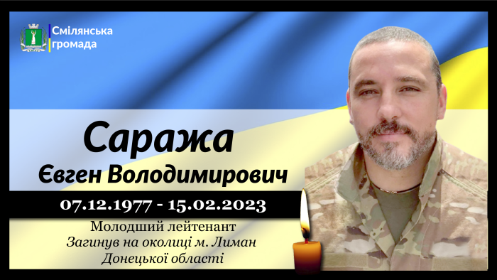 Молодший лейтенант, помічник начальника штабу - начальник розвідки першого механізованого батальйону військової частини Збройних Сил України, позивний "Джек" Євген Саража загинув 15 лютого 2023 року на околиці міста Лиман, Донецької області внаслідок прильоту ракети у розташування командно-спостережного пункту першого механізованого батальйону.