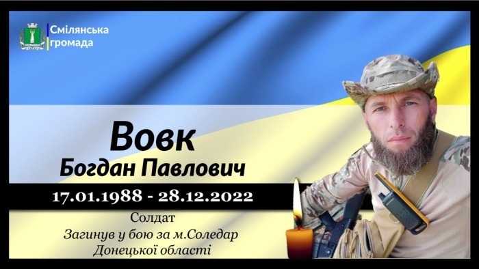 Солдат Богдан Вовк, позивний Мурчик, загинув 28 грудня 2022 року у бою з окупантами за місто Соледар на Донеччині. Воїну було 34 роки.