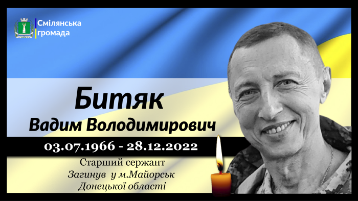 Старший сержант, навідник 1-го штурмового відділення 1-го штурмового взводу 1-ої штурмової роти 3-го штурмового батальйону військової частини ЗСУ Вадим Битяк, гідно виконуючи свій військовий обов’язок, героїчно загинув 28 грудня 2022 року внаслідок штурмових дій противника в Донецькій області. Беручи участь в обороні держави та стримуванні збройної агресії російської федерації, до кінця залишився вірним військовій присязі.