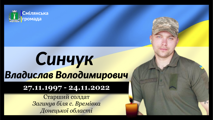 Старший солдат, старший водій стрілецького відділення стрілецького взводу стрілецької роти стрілецького батальйону військової частини ЗСУ Владислав Синчук загинув 24 листопада 2022 року під час запеклого бою з окупантами внаслідок ворожого обстрілу біля населеного пункту Времівка, Донецької області.
