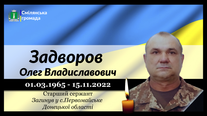 Старший сержант, старший стрілець другого мотопіхотного відділення третього мотопіхотного взводу третьої мотопіхотної роти військової частини ЗСУ Олег Задворов загинув 15 листопада 2022 року під час виконання завдань, пов'язаних із забезпеченням національної безпеки і оборони, відсічі і стримування збройної агресії російської федерації у с.Первомайське Донецької області.