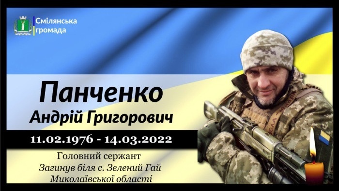 Головний сержант 2-го мотопіхотного взводу 1-ої мотопіхотної роти Андрій Панченко на псевдо "Сміла" загинув 14 березня 2022 року під час артилерійського обстрілу та авіаударів біля н.п.Зелений Гай на Миколаївщині.