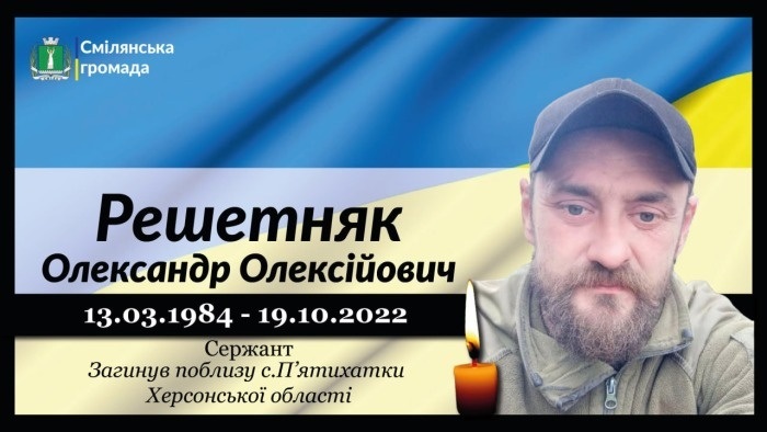Сержант Решетняк Олександр Олексійович служив механіком-водієм танкового взводу танкової роти танкового батальйону військової частини ЗСУ. Більше півтора року рідні нашого земляка чекали, надія на його повернення додому живим не згасала ні на секунду. Він вважався зниклим безвісти із 19 жовтня 2022 року. Але, на жаль, надійшла страшна звістка: тіло ідентифікували. Олександр Решетняк, вірний присязі, мужньо виконавши свій військовий обов’язок, загинув під час ведення бойових дій в районі н.п. П’ятихатки, Херсонської області. Йому навіки залишиться 38.