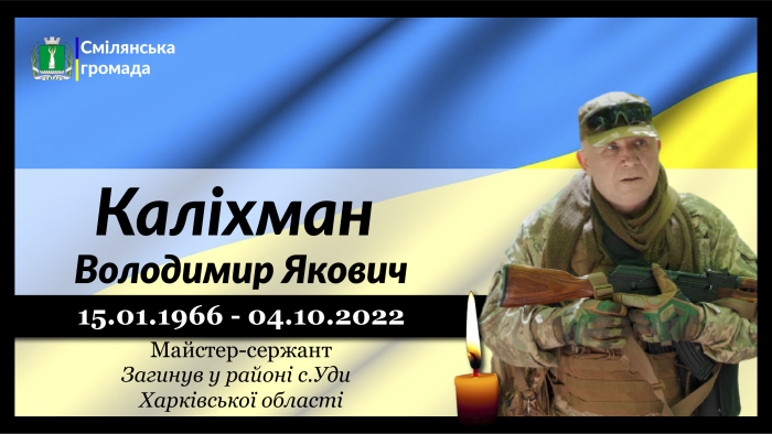Майстер-сержант, сержант із матеріального забезпечення стрілецької роти військової частини ЗСУ 56-річний Володимир Каліхман, позивний Прапор, загинув 4 жовтня 2022 року під час ворожого обстрілу в районі села Уди Харківської області.
