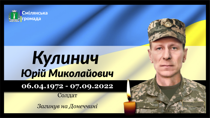 Солдат механізованого відділення механізованого взводу механізованої роти механізованого батальйону військової частини ЗСУ Юрій Кулинич героїчно загинув 7 вересня 2022 року внаслідок стрілецького бою з диверсійною групою біля населеного пункту Авдіївка, Донецької області.