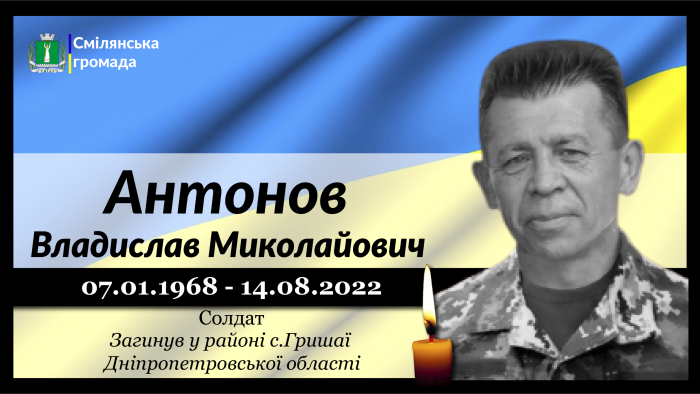 Солдат військової служби за призовом під час мобілізації, кухар їдальні взводу матеріального забезпечення Владислав Антонов помер 14 серпня 2022 року в районі с.Гришаї, Васильківського району Дніпропетровської області.