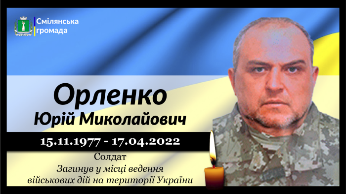 Cолдат - навідник механізованого відділення механізованого взводу механізованої роти механізованого батальйону військової частини ЗСУ Юрій Орленко загинув 17 квітня 2022 року під час виконання службових обов'язків. Вірний військовій призязі наш мужній воїн віддав своє життя за Україну, за її незалежність та територіальну цілісність, за спокій сердець та за майбутнє кожного українця.