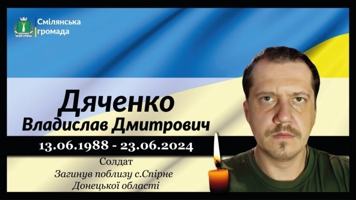 Солдат ДЯЧЕНКО Владислав Дмитрович загинув 23 червня 2024 року в н.п.Спірне, Бахмутського району, Донецької області. Мужній воїн, захисник України боронив свою державу, свою землю, життя своїх співвітчизників від російських загарбників. Йому назавжди 36.