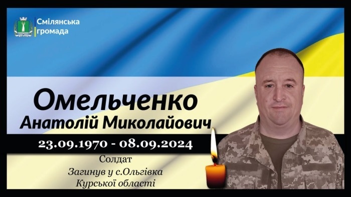 Солдат Анатолій Миколайович ОМЕЛЬЧЕНКО загинув 8 вересня 2024 року внаслідок ураження FPV-дроном по ББМ МаххPro у районі н.п. Ольгівка Курської області, виконавши з честю свій військовий обов’язок.