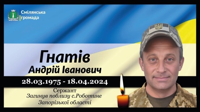 Сержант, командир 3-го відділення взводу протитанкових керованих ракет військової частини Збройних Сил України Андрій Гнатів загинув на Запорізькому напрямку фронту при виконанні бойового завдання в бою за Україну, її свободу та незалежність.