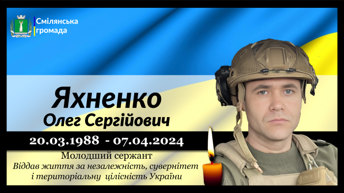 Молодший сержант Олег Сергійович ЯХНЕНКО помер 7 квітня 2024 року від отриманих травм у ДТП.