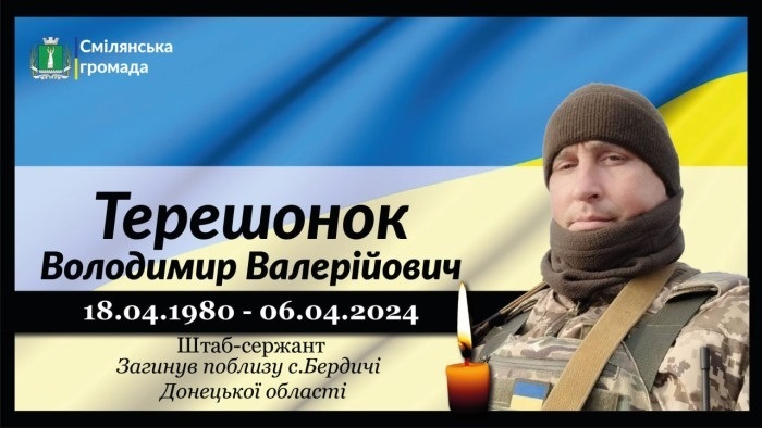 Штаб-сержант, навідник 2 механізованого відділення 3 механізованого взводу 6 механізованої роти 2 механізованого батальйону військової частини ЗСУ Володимир Валерійович ТЕРЕШОНОК загинув 6 квітня поблизу с.Бердичі Покровського району Донецької області внаслідок мінометного обстрілу позицій підрозділу.