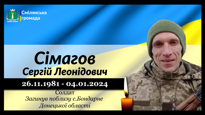 Солдат Сергій Сімагов проходив службу на посаді оператора 1-го відділення протитанкових керованих ракет взводу протитанкових керованих ракет військової частини ЗСУ. 4 січня 2024 року загинув поблизу с.Бондарне Бахмутського району Донецької області, в результаті враження транспортного засобу ворожим дроном-камікадзе.