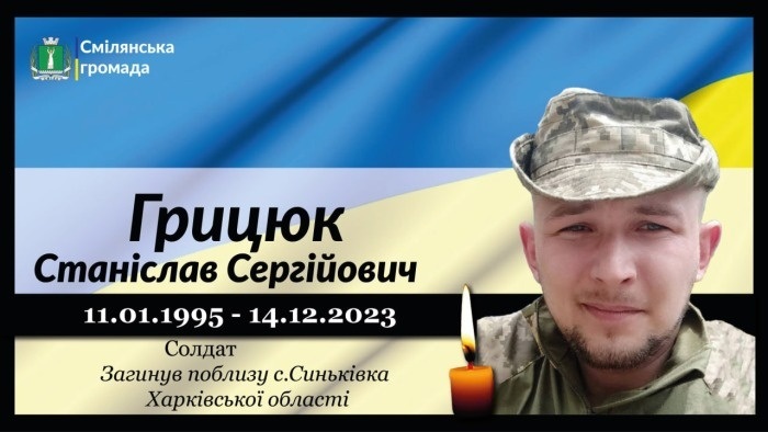Солдат, командир 2-го десантно-штурмового відділення 1-го десантно-штурмового взводу 4-ої десантно-штурмової роти 1-го десантно-штурмового батальйону військової частини ЗСУ Станіслав Грицюк загинув 14 грудня 2023 року внаслідок артилерійського обстрілу у районі н.п. Синьківка, Куп’янського району, Харківської області. Меньш ніж за місяць, 11 січня мав би відзначати своє 29-ти річчя... мав би і святкував би, якби не війна..., якби не клятий ворог...