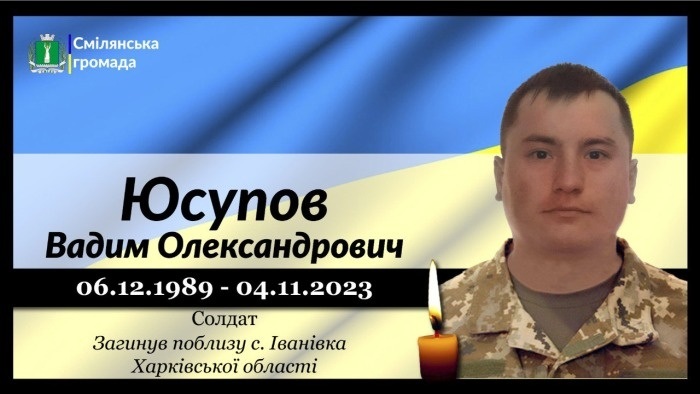 Солдат, старший стрілець 2-го стрілецького відділення 1-го стрілецького взводу 3-ої стрілецької роти військової частини ЗСУ Вадим Юсупов загинув 4 листопада 2023 року потрапивши під артилерійський обстріл в районі населеного пункту Іванівка, Куп’янського району, Харківської області.