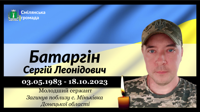 Справжній воїн, патріот, смілянин Батаргін Сергій Леонідович до останнього стояв на захисті нашої Батьківщини. У 40-річному віці віддав життя за те, щоб російський окупант не став на нашу благословенну землю.