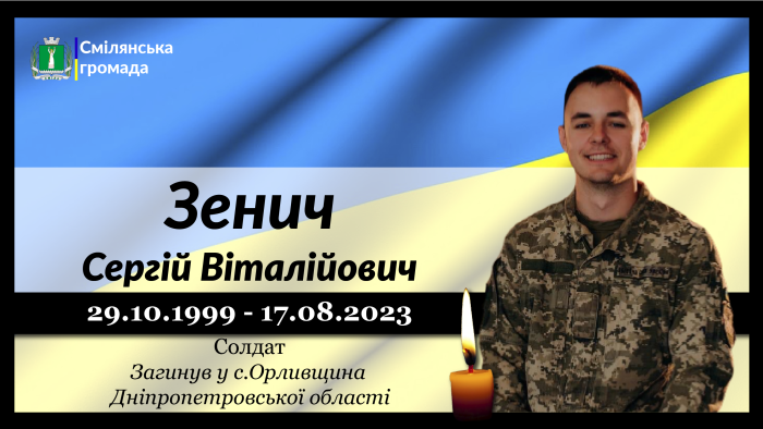 Солдат, механік відділення технічного забезпечення військової частини Збройних сил України Зенич Сергій Віталійович загинув 17 серпня 2023 року внаслідок ракетного обстрілу с.Орливщина, Новомосковського району, Дніпропетровської області. Молодий, спортивний, енергійний, сміливий - таким назавжди залишиться в пам'яті всіх наш Герой.