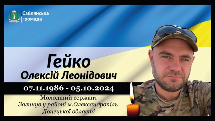 Молодший сержант, командир відділення інженерно-саперного взводу 1 - го аеромобільного батальйону 46-ї окремої аеромобільної бригади Десантно - штурмових військ Збройних Сил України Олексій Леонідович ГЕЙКО загинув 5 жовтня 2024 року в с.Олександропіль, Краматорського району, Донецької області внаслідок атаки ворожого дрона.